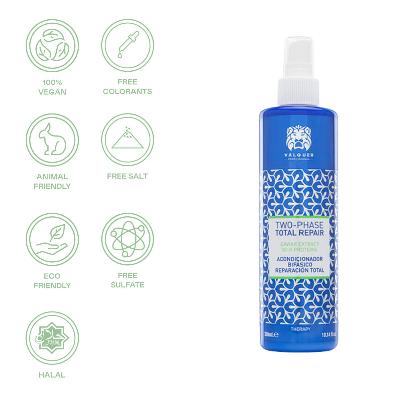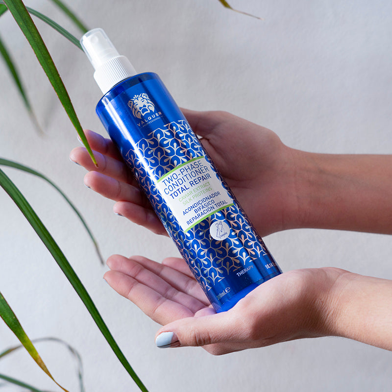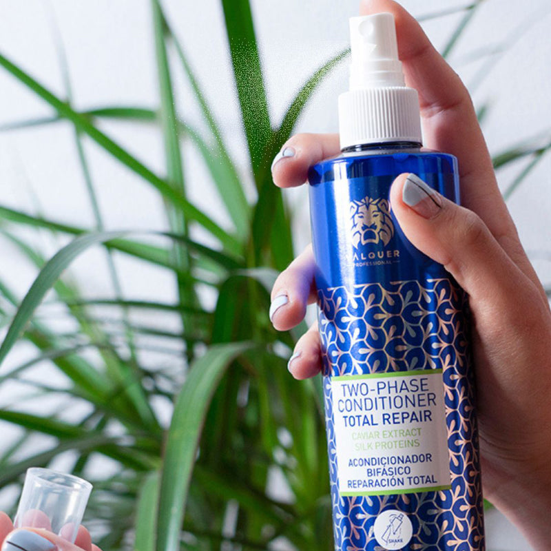 Acondicionador bifásico para cabellos dañados y secos, formulado con Caviar Verde y Cápsulas de Algodón, que te ayudará a reavivar la salud de tu cabello.. BENEFICIOS. Cuando se agita, la fusión de las dos fases que contiene potencia sus activos y logra un desenredado inmediato, nada más pulveriza sobre el cabello húmedo o seco, siendo ideal para reparar e hidratar el cabello.. FORMULACIÓN HIDRATANTE REPARADORA. Gracias a sus activos, este acondicionador nutre e hidrata el pelo durante todo el día, previniendo de la irritación y los picores.. Su principal ingrediente el caviar verde, un alga que utilizado en cosmética, se convierte en un potente hidratante que mejora la elasticidad, al tiempo que ejerce un poder suavizante y reafirmante sobre el pelo, contiene además, polisacáridos, esteroles y proteínas: ingredientes en equilibrio natural que ayudan a recuperar la vitalidad del cabello.. Por su parte, las "cápsulas de algodón" no son otras que las pequeñas vainas verdes que contienen las semillas de esta planta, cuyas flores de color blanco cremoso, se vuelven de color rosa intenso y caen, y que confieren suavidad y frescura.. GAMA TOTAL REPAIR. Y para que el tratamiento sea mucho más efectivo, se recomienda utilizar toda la línea de Reparación Total:. Champú Reparador Zero% - 400 ml. Mascarilla Capilar Reparadora - 300 ml. Serum capilar intensivo Reparación Total - 200 ml. Ayuda a proporcionar suavidad extrema del cabello y confiere acabado sedoso y manejable del mismo, sin dejar ningún tipo de residuos.