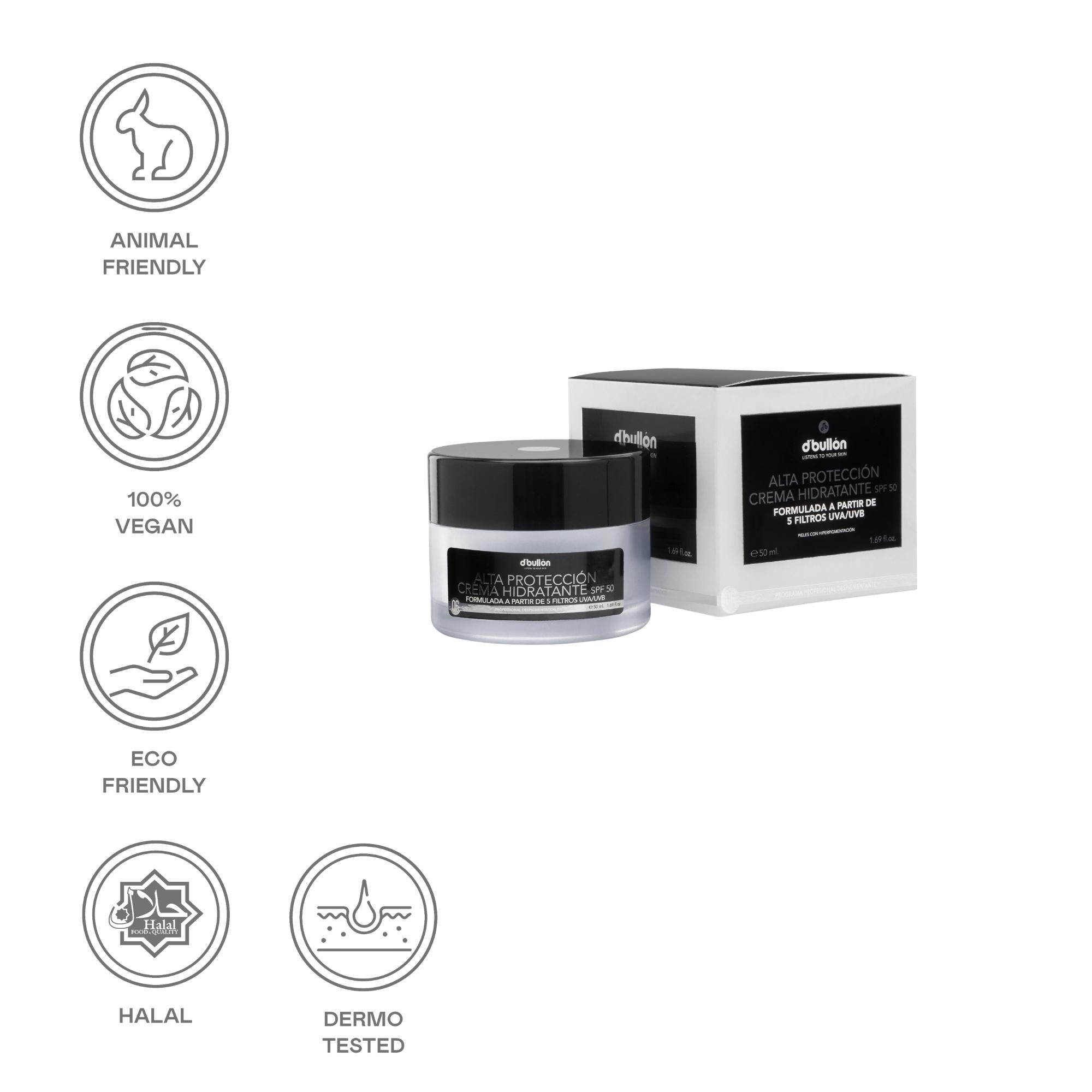 Crema hidratante con alta protección solar SPF 50.. Formulada a partir de 5 filtros UVA/UVB, es una crema que presenta un factor de protección alto (SPF50), obtenido a partir de la combinación de estos filtros diferentes. Contiene Hydromanil®, innovador hidratante natural que captura, retiene y asimila el agua de la piel, de forma inmediata y duradera. Aporta alta protección frente a las radiaciones ultravioleta tanto UVA como UVB. Paralelamente hidrata en profundidad y es muy adecuada para la hidratación de la piel con tendencia a la aparición de manchas y con poca tolerancia al sol. Cuenta con certificación Halal.
