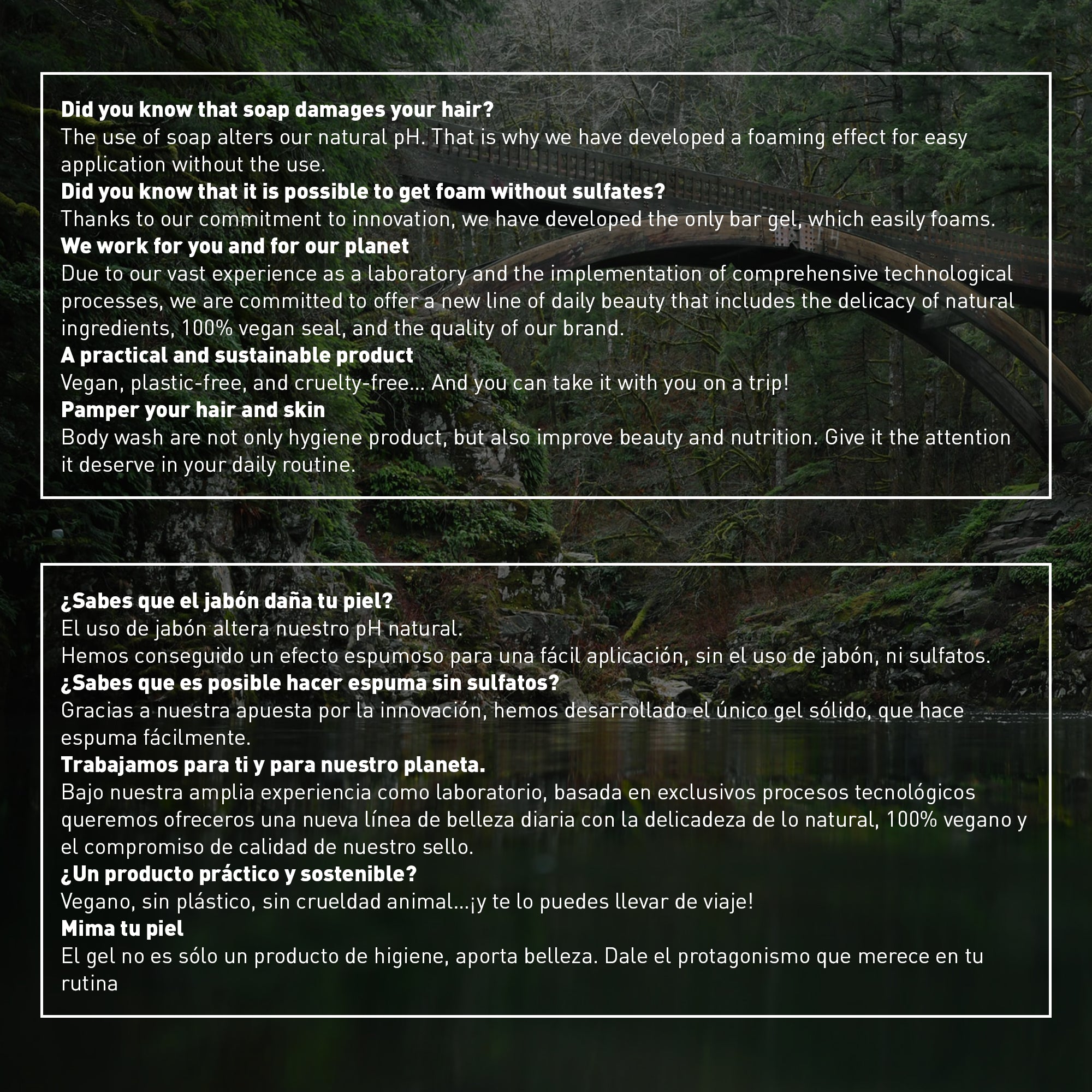 Con los geles sólidos libres de plástico además de cuidar tu piel cuidas del planeta:- Totalmente respetuoso con el medio ambiente.