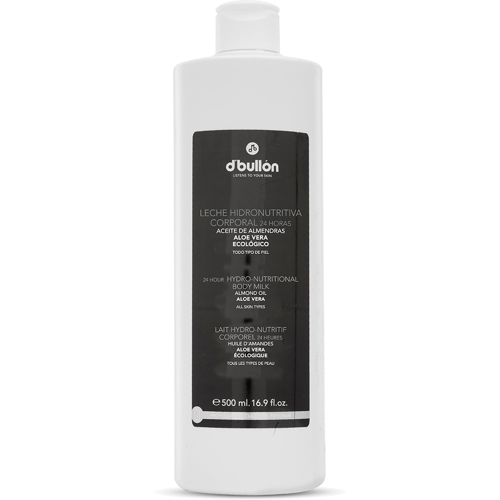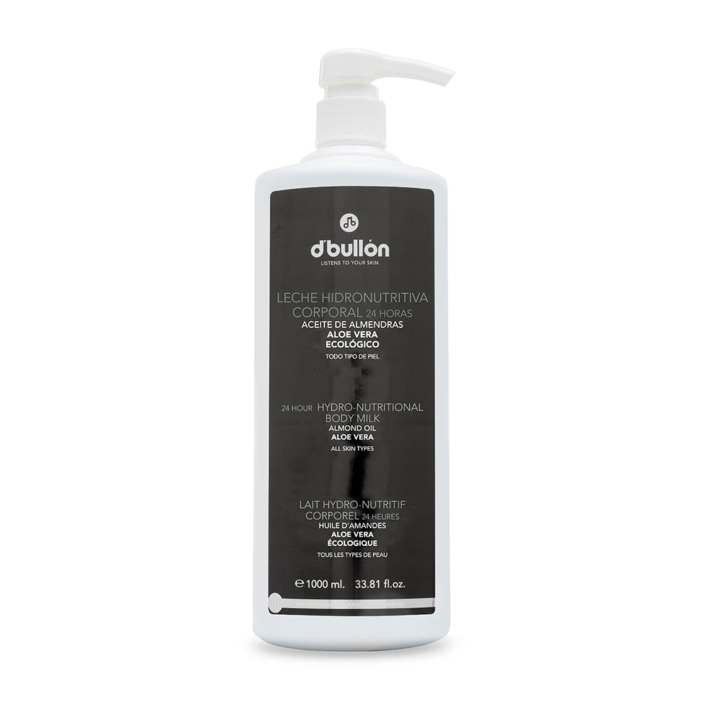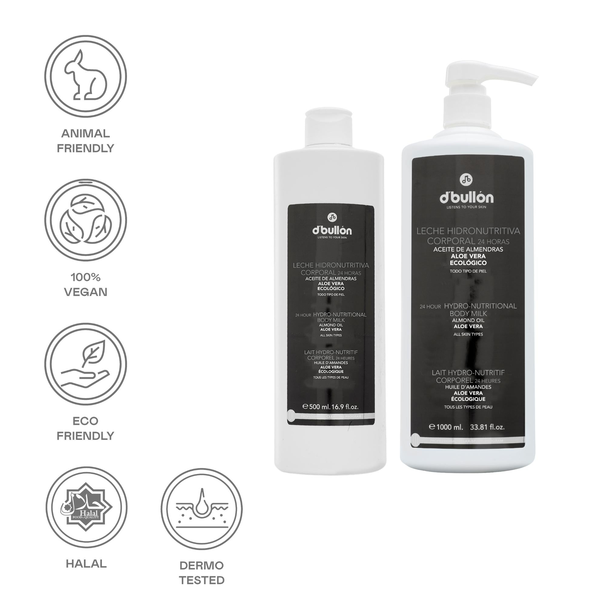 Leche corporal hidronutritiva 24 horas de gran efecto emoliente. Su acción se basa en las propiedades hidratantes y nutrientes, principalmente del Aceite de Almendras 100% natural, que aporta a la piel suavidad, elasticidad y tersura: con el resultado de una gran hidratación las 24 horas, y de una piel luminosa y joven. Además, no engrasa y deja un tacto muy suave. Y los ácidos grasos Omega 3 y Omega 6, junto a las propiedades vitamínicas y antioxidantes del Aceite de Almendras, convierten a este ingrediente, en uno de los más beneficiosos para combatir las arrugas.. Junto al anterior, encontramos el poder calmante y regenerante del Aloe Vera Ecológico, muy utilizado también en las lesiones de la piel, fundamentalmente por su poder emoliente y suavizante. Esta acción se debe a su contenido en mucílagos que son higroscópicos:es decir, que absorben y retienen el agua bajo ciertas condiciones, siendo así perfectos agentes humectantes para la epidermis.. Esta leche corporal está indicada para todo tipo de pieles y cuenta con el certificado Halal.
