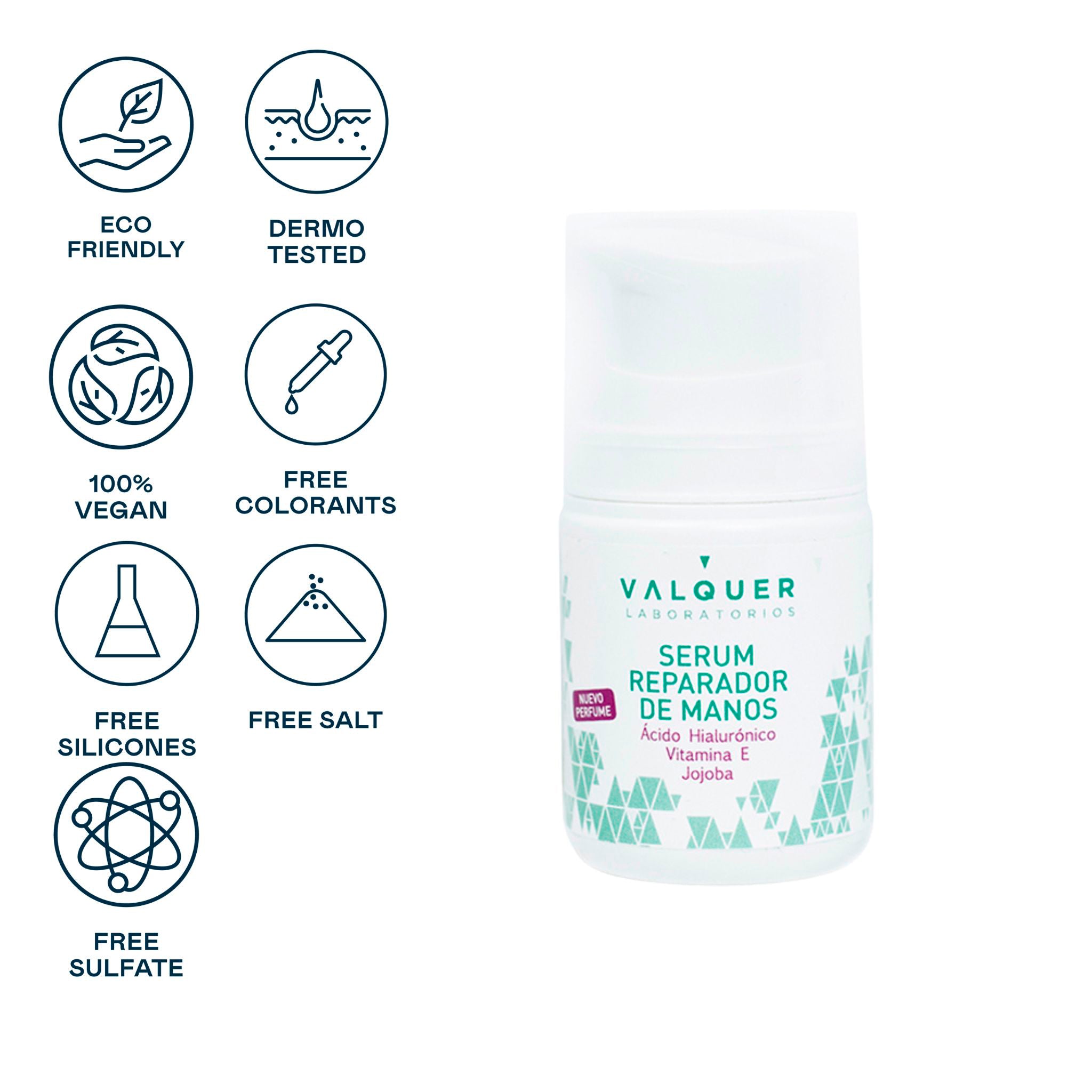 Este serum sedoso de manos es el cocktail más potente de propiedades antienvejecimiento, hidratantes y reparadoras. Especialmente desarrollado para manos secas e irritadas.Ha sido especialmente desarrollado para aquellas manos que sufren de sequedad e irritación. Además, es un cosmético vegano. Cabe destacar su innovadora fórmula en la que se incluyen los siguientes activos:. Ácido hialurónico: ayuda a proteger el propio ácido hialurónico de la piel, contribuyendo al efecto antienvejecimiento preventivo. Hidrata las capas más superficiales de la piel, proporcionando una hidratación a largo plazo.. Jojoba: activo hidratante,formador de película sobre la piel, apropiado para mejorar la resistencia al agua y la permanencia del activo hidratante y emoliente sobre la piel.. Vitamina E: antioxidante, combate el envejecimiento.
